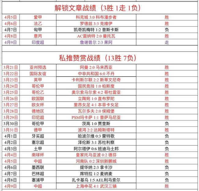 周二私推赞赏1场,完美全胜拿下,上海申花轻松大胜,私推赞赏近20胜13,还需努力!解锁文章1场走了,被补时绝沙,没能胜利很可惜,解锁文章近4胜3!私推总进球数1场没有打出,判断错误,私推总进球数近35胜24,状态稳定!