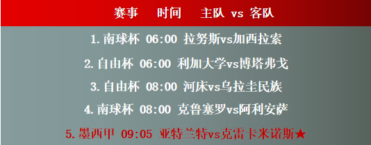 赛事前瞻:本文提供04月12日06时00分-09时05分时段的5场足球赛事走势分析表,当中包括南球杯、自由杯、墨西甲等赛事提供分析参考,具备较高的参考价值。主要关注赛程如下: