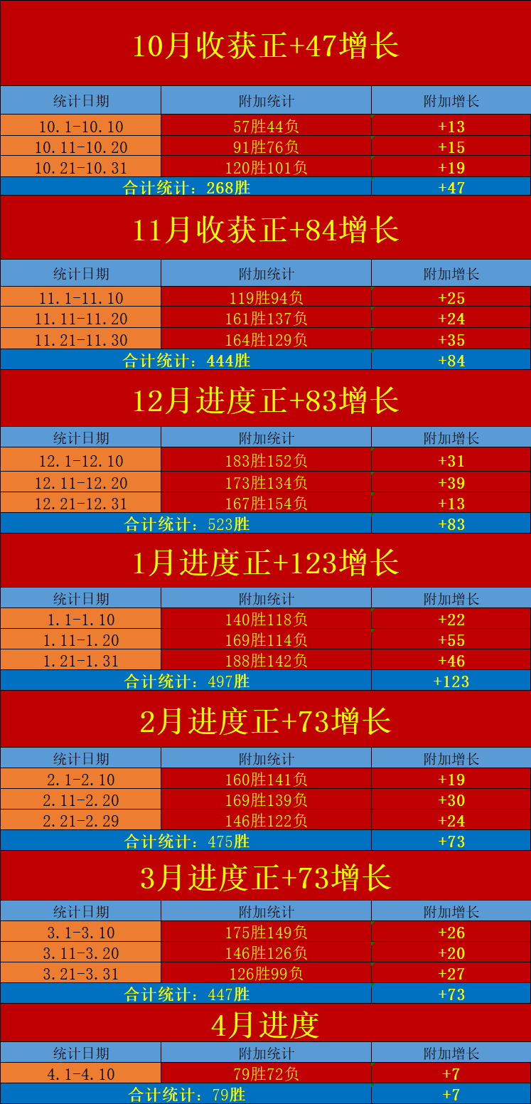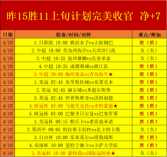 昨天已完成赛程拿下11场胜利,4月上旬收官赛程表现炸裂,拿下净+7的优质增长,除了亚系赛事保持了稳定增长以外,欧冠杯领衔的欧赛5场更是顺利全数击中!笔者预期的第19个胜利旬计划完美拿下,在过去的半年时间里,笔者交出了连续18个胜利旬计划的增长表现,数据击中能力整体稳定,第19个旬计划也经历了一段低开高走的数据表现后顺利完成收官赛程,继续保持对数据模块的信任和追踪,才是真正能够收获正向增长的关键动作,本日继续精选值得关注的焦点赛程进行组合冲击,争取尽快与大家携手回到胜利增长轨道!