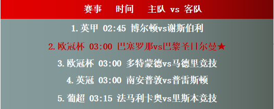 2. 巴塞罗那vs巴黎圣日尔曼,巴塞罗那西甲赛季16轮主场比赛12胜1平,攻守端数据发挥十分优秀,场均进球超过2个,锋线得分效率保持强势,本轮欧冠杯主场迎战对手是巴黎圣日耳曼,后者赛季14轮作客比赛10胜4平,攻守端数据发挥堪称完美,巴黎圣日耳曼首回合交锋里处于劣势,本回合作客已无退路可言。