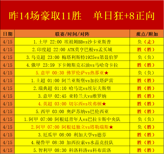 昨完成的14场比赛豪取11场胜利数据,单日收获狂+8的优质正向,中旬数据计划在经历了数天厚积薄发的阶段迎来了精彩的井喷,从早场亚欧精选开始到欧赛数据的全胜,大部分精彩赛事的走向都几乎与数据预判的走势一致,呈现出了一个惊人的方向契合度!