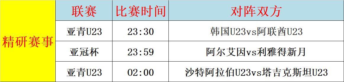 3、沙特阿拉伯U23vs塔吉克斯坦U23:沙特阿拉伯U23近10战6胜3平1负,近3战全胜,塔吉克斯坦U23近10战取得4胜4平2负,近期处于进攻乏力的阶段。