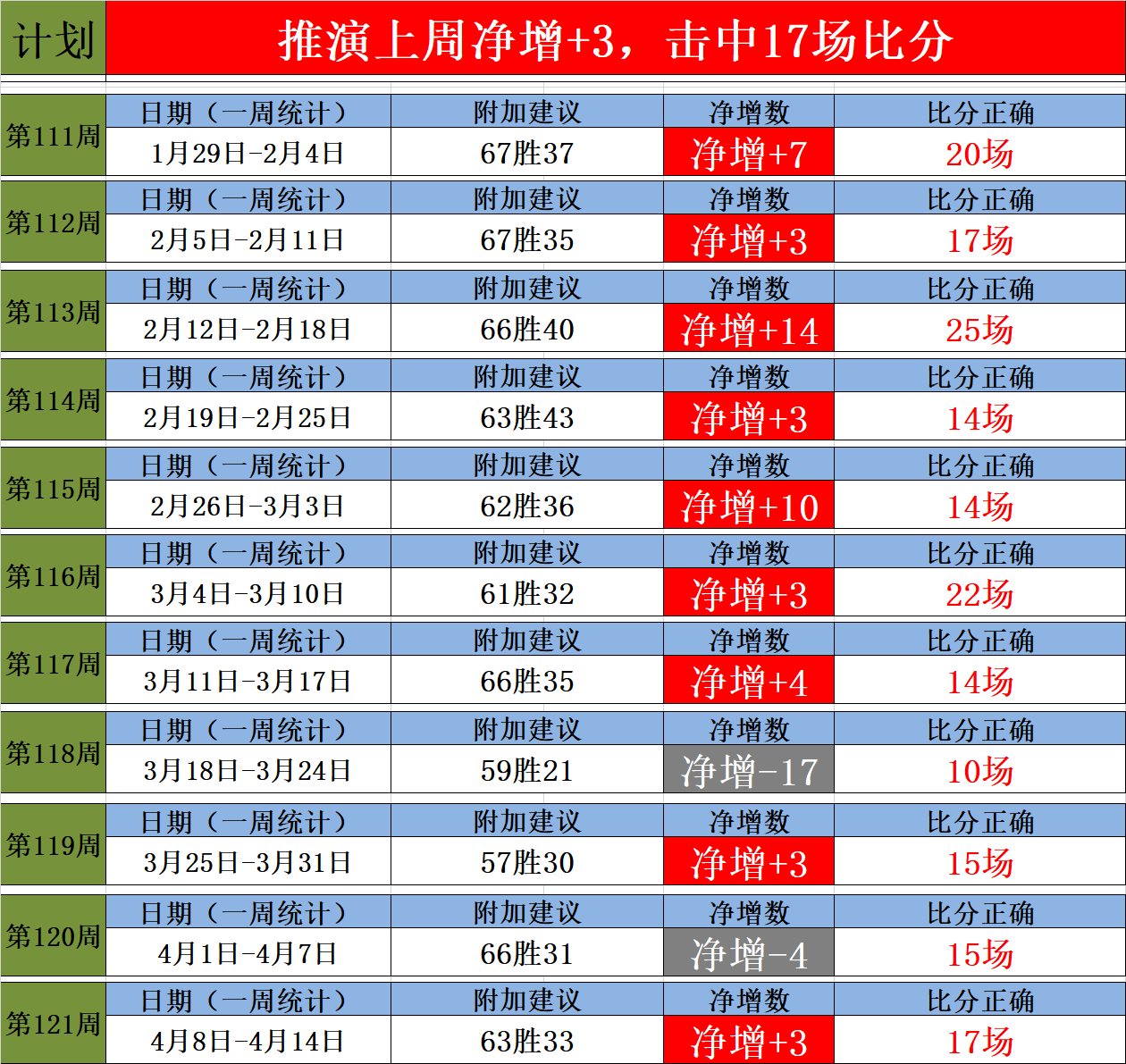 2、推演士计划第121周(走不纳入统计)完美结束,上周净增+3场,预测17场比分正确,持续的保持了高效的稳定。