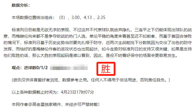 (温馨提示:观点回顾为已完场赛事的统计,并不能代表未来的观点预测结果走势,观点仅为其个人意见,与平.台无关。资讯仅供体育爱好者浏览,并不构成购.彩建议,任何人不得用于非法用途,请广大用户理性消费。)