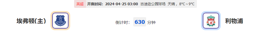 北京时间04月25日03:00,2023-2024英格兰超级联赛:埃弗顿vs利物浦;利物浦在少战一轮的情况下,落后阿森纳3分,今天面对弱旅埃弗顿能否成功取得一场完胜?