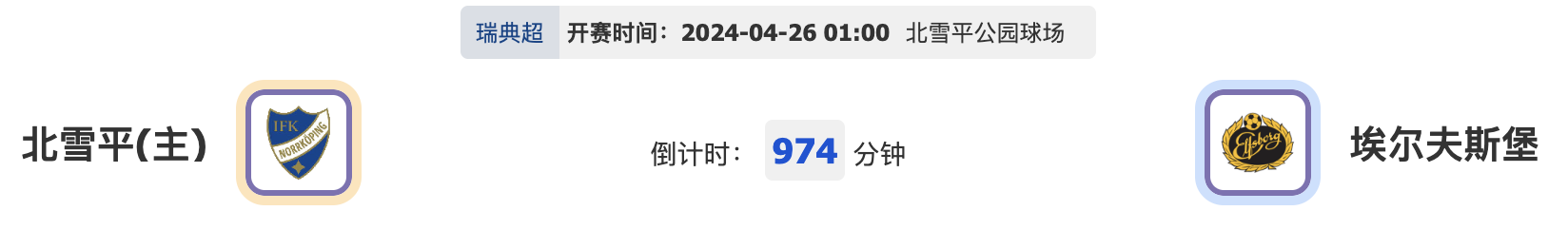 北京时间4月26日凌晨01:00,瑞典超第5轮的比赛将会继续展开,北雪平队将会在主场迎来埃尔夫斯堡队的挑战,球队能否在主场拿下3分呢?