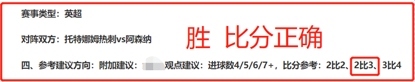 3、英超:托特纳姆热刺vs阿森纳 (胜)√: 该场比赛笔者主要看好的是双方都会进球,再看阿森纳取胜,因为热刺有进攻端的主力回归,需要争取欧冠区的热刺再加上主场作战的战意,是不会死守的,再加上阿森纳是进攻型的球队,笔者判断大概率是会对攻的,比赛过程也很精彩,都在笔者的预测之中(2比3,大比分预测正确)
