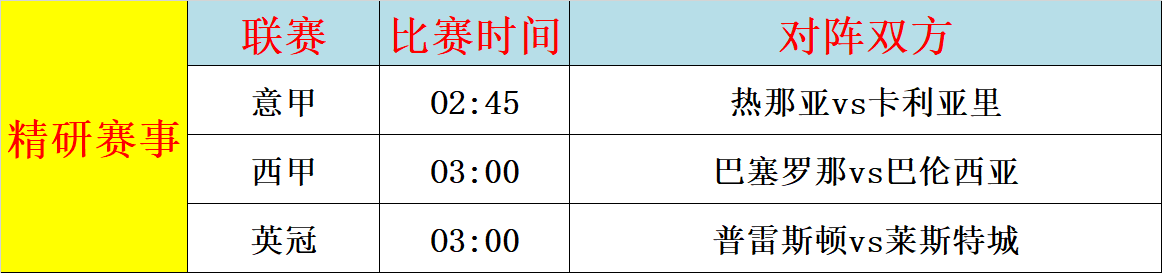 1、热那亚vs卡利亚里:热那亚联赛33战9胜12平12负,排名联赛第12,联赛保级无忧,卡利亚里联赛33战7胜11平15负,排名第14,保级压力还在。