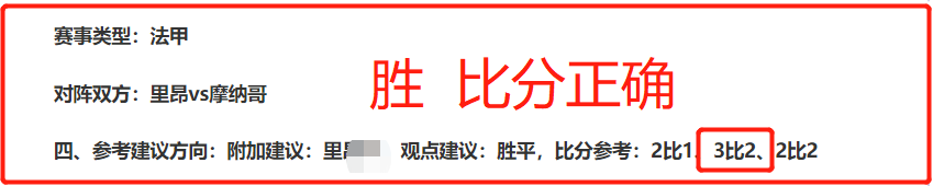 7、法甲:里昂vs摩纳哥 (胜)√:该场比赛算是场小冷门,连战连胜的摩纳哥本场居然没有得到数据的支持,这令人有疑惑,笔者果断的选择了主胜方向,因为摩纳哥的门槛太低,风险大(3比2,大比分预测正确)