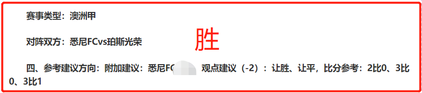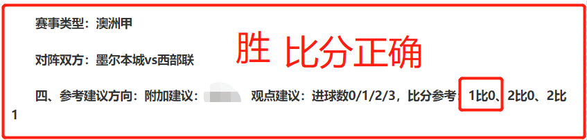 2、澳洲甲:墨尔本城vs西部联 (胜)√:该场比赛是和前面的悉尼形成了交差,先是悉尼打出了超大比分,这场的进球数顺势调整,来吸引大的方向,这正是交叉数据的陷阱,笔者已经在早前发现了这一端倪,而且作出了准确的判断,结果十分准确(1比0,比分预测正确)
