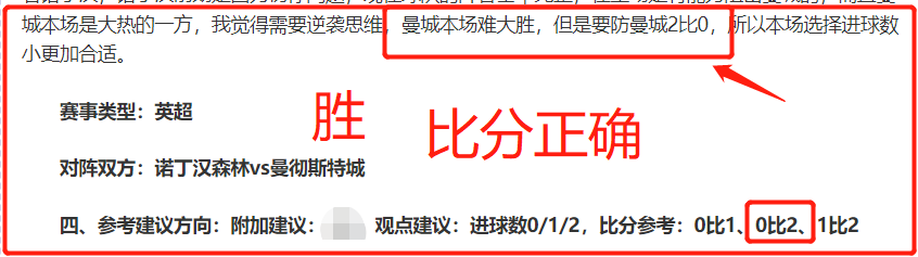6、英超:诺丁汉森林vs曼彻斯特城 (胜)√:该场比赛关注度超高,这场比赛也是和阿森纳的形成了反差,进球数据比阿森纳低一个档,就已经说明曼城本场难大胜,但为了保守起见,笔者也在分析中说明,要提防曼城2比0取胜,所以选择了比较问题的进球数小,结果不出笔者的预测,曼城果然是2比0取胜,笔者对整个比赛的节奏了如指掌(0比2,比分预测正确)