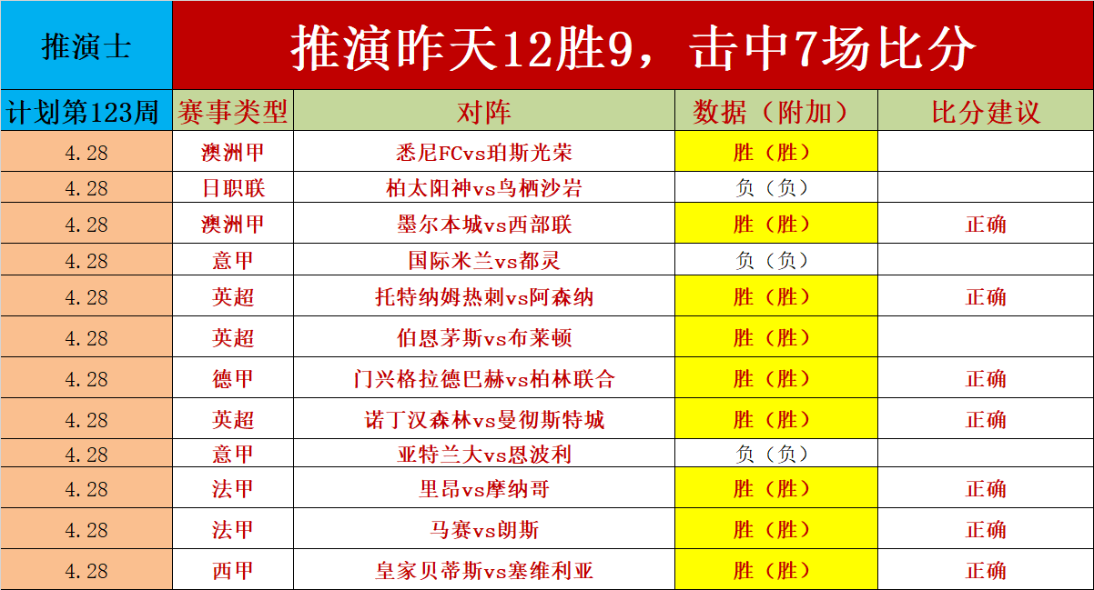 3、推演士计划第123周完美结束,上周疯狂净增长,净增+9场,预测18场比分正确,持续的保持了高效的稳定(走不纳入统计)