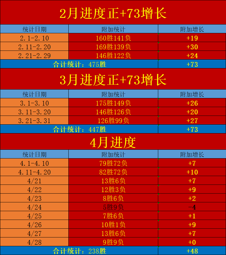 昨天赛程继续保持稳定数据击中能力拿下9场胜利观点分享,周六日的赛程合计拿下优秀的22场胜利观点并转化出净+7的正向增长,下旬8天赛程目前取得净+31的精彩正向增幅,整体4月进度胜利转化正向净+48,继续对数据赛程进行一些微调和修正,争取延续优秀正向基础,下旬计划继续向着更高数据峰值发起冲刺!