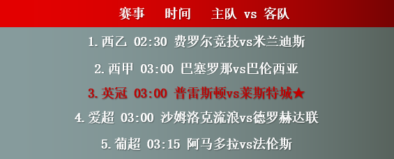 3. 普雷斯顿vs莱斯特城★,普雷斯顿赛季22轮主场比赛11胜4平,攻守端数据发挥能进也能失,主场表现波动较大,赛季主场鲜有平局出现,目前普雷斯顿在英冠联赛以63个积分处于中游位置,剩余赛程对于球队来说没有太大的抢分意义,尤其是在进入赛程下半旬以来,普雷斯顿的对赛表现出现了较大反差的下滑,近期的3场比赛里球队的中前场持续哑火,连续3战遭到对手零封击败,上战更是败在了排名接近保级边缘线的下半区球队女王公园巡游者手上,缺乏抢分战意下整体状态比较疲弱,本轮迎战对手是莱斯特城,后者赛季22轮作客比赛取得13胜3平,攻守端数据发挥十分优秀,前场交出了1.8个场均进球数据,球队为了抢夺分数尽快回到英超联赛卯足了干劲,目前莱斯特城以94个积分处英冠的直升位置,上场比赛在主场5:0大胜了南安普敦,全取3分之下已经提前了一轮锁定直升名额,全队上下均处于一个冲超成功的喜悦状态,但由于莱斯特城因为违规问题无法与功勋球员进行续约,对于帮助莱斯特城完成冲超的部分主力来说,剩余的两轮联赛已经是在莱斯特城的告别之战。
