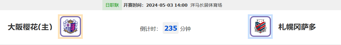 北京时间5月3日14:00,大阪樱花战札幌冈萨多,大阪樱花上场对横滨水手,大阪樱花是2-2平对手,札幌冈萨多上场3-3平湘南海洋,本场交锋,走势会怎样?