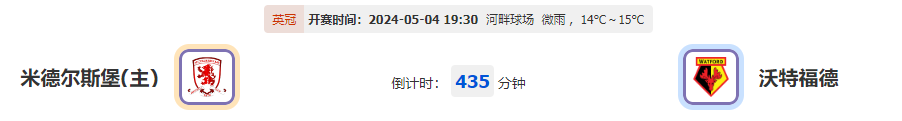 北京时间2024年05月04日 19时30分,英冠联赛第46轮的赛事,米德尔斯堡不胜的势头表现结束,沃特福德会有反击底气?让我们一起拭目以待!