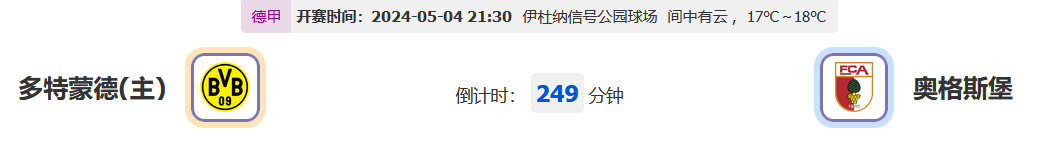 北京时间5月4日21时30分,德甲联赛2023-2024赛季第32轮比赛,多特蒙德vs奥格斯堡,主队近期双线作战,除了分心联赛以外还是应付强度更高的欧冠赛程,本轮主场面对着联赛中游队伍,能否轻松抵挡客队攻势?我们一起拭目以待!