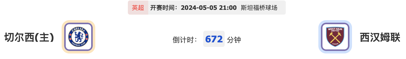 北京时间5月5日晚21:00,英超第36轮的比赛将会继续展开,切尔西队将会在主场迎来西汉姆联队的挑战,球队能否在主场拿下3分呢?