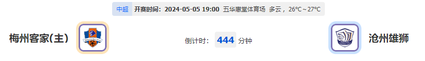 北京时间05月05日19时00分,中超2023-2024赛季第10轮比赛,梅州客家vs沧州雄狮,主队现在保持不败的成绩使得士气方面回升不少,本次主场迎战此前在下游陷入低迷表现的沧州雄狮,能否顺利捍卫主场重新抢分抢胜?让我们拭目以待!