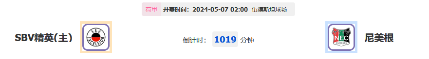北京时间05月07日02:00,2023-2024 荷兰甲组联赛,SBV精英vs尼美根,尼美根目前处于联赛第六名位置,想要争夺欧战席位难度较大,今天比赛还会有战意吗?