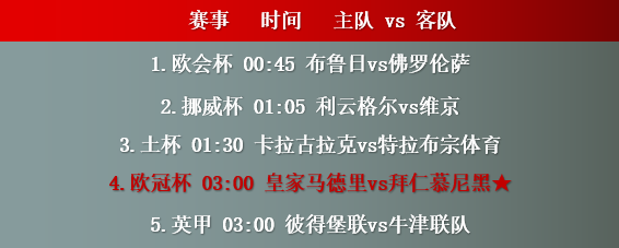 4. 皇家马德里vs拜仁慕尼黑★,皇家马德里西甲赛季17轮主场比赛取得15胜2平不败得分表现,攻守端数据发挥堪称完美,得失比超过4:1,场均交出2.5个强势的进球数据,皇家马德里上场比赛在主场迎战联赛的保级队伍加的斯轻松以3:0的比分拿下胜利,顺利拿下3个积分后提前锁定了西甲本赛季的冠军荣誉,剩余的赛程能够很好的将精力放到本次的欧冠杯比赛,皇家马德里作为西甲的传统豪门在欧冠杯赛程里拥有着优秀的历史战绩,近年来未有过主场遭到挫败的成绩,主场强势实力可见一斑,本回合迎战对手是德甲传统豪门拜仁慕尼黑,后者德甲赛季16轮作客比赛取得9胜2平得分表现,攻守端数据发挥优秀,但防线出现了场均接近2球的糟糕数据,成为了本赛季拜仁无法卫冕联赛冠军的主要弱项之一,目前拜仁慕尼黑已经失去了赛季争冠的机会,剩余赛程球队在联赛的欧冠席位也是不会受到冲击,接下来球队同样能够将更多的精力交出来应对本次的欧冠杯决赛圈的争夺资格。