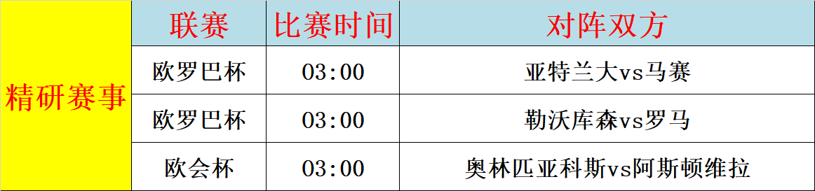 1、亚特兰大vs马赛:亚特兰大联联赛34战18胜6平10负,排名联赛第5,马赛联赛31战11胜11平9负,排名第9。