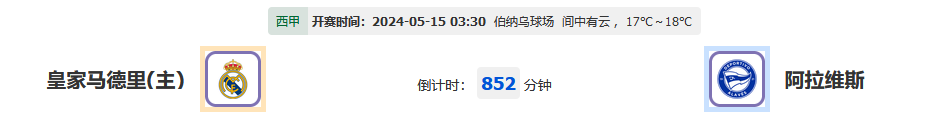 北京时间05月15日03:30,2023-2024 西班牙甲组联赛,皇家马德里vs阿拉维斯,皇家马德里目前处于联赛榜首,今天比赛还是坐镇主场,能否顺利取得完胜呢?