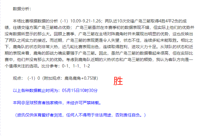 (温馨提示:观点回顾为已完场赛事的统计,并不能代表未来的观点预测结果走势,观点仅为其个人意见,与平.台无关。资讯仅供体育爱好者浏览,并不构成购.彩建议,任何人不得用于非法用途,请广大用户理性消费。)