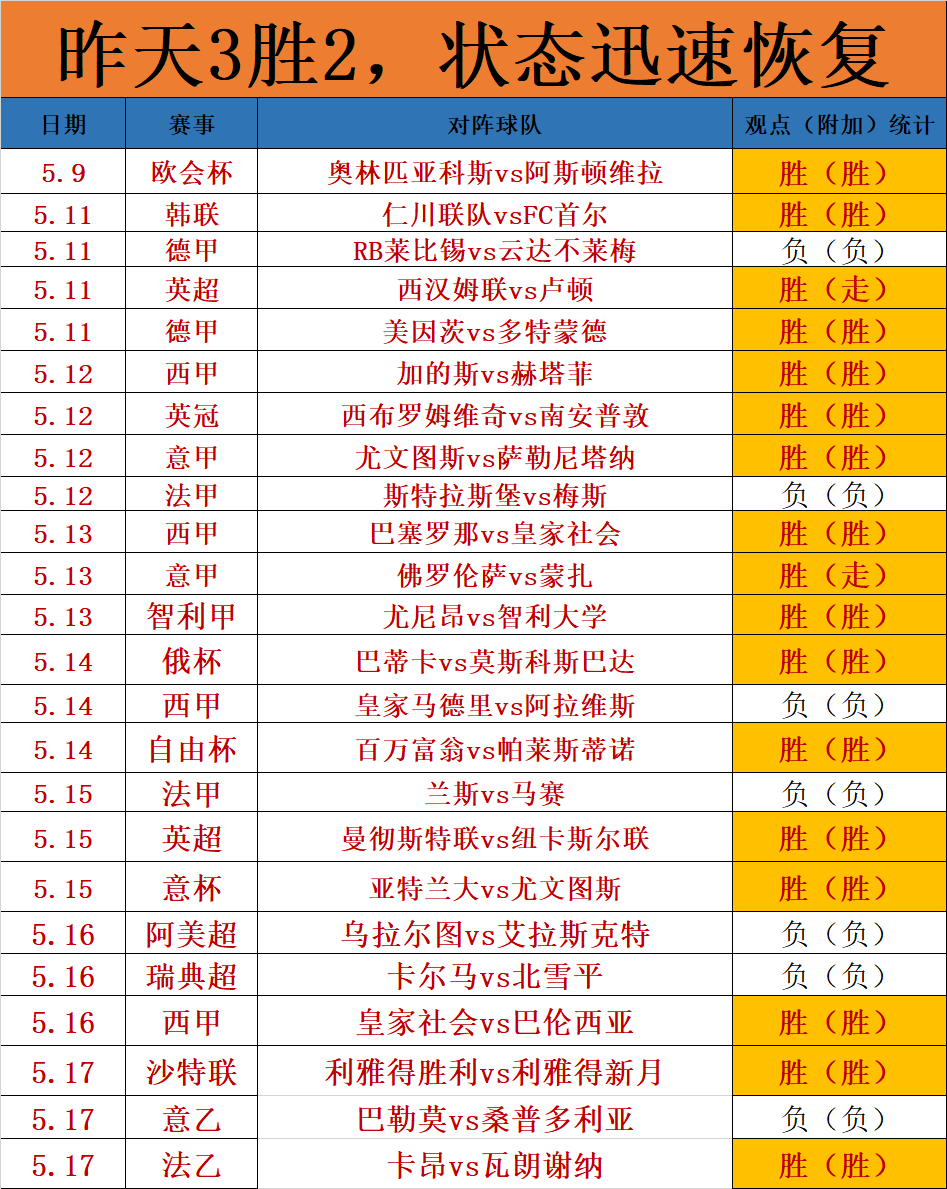 一、战绩回顾:昨天詹姆斯迅速回归猛劲,一举拿下3胜2的战绩,目前战绩在近20胜14的状态,今天有4场五星建议。