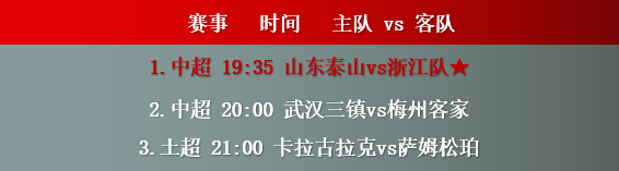 1.山东泰山vs浙江队★,山东泰山赛季7轮主场比赛取得4胜2平得分表现,攻守端数据发挥比较优秀,前场交出了场均超过2个进球的进攻数据,在目前联赛主场得分效率上稳居一线,但是相比起其他的前列争冠队伍,山东泰山本赛季的防线表现是缺乏说服力的,在前面的主场赛程里,山东泰山场均失球达到1.6个,近期作客的一些球队如南通支云和深圳新鹏城等队伍的锋线能力都并不算强势,然而山东泰山还是无法交出稳定后场发挥来零封对手,赛季的后场环节已经成为了球队在对赛失分上的隐患,上场比赛作客挑战天津津门虎还是被对手凭借为数不多的攻势凭借外援康帕尼奥的远距离头球敲开大门,作为球队门神的王大雷显然是难辞其咎的,在后续的比赛里显然是需要作出一些调整,本轮主场迎战对手是浙江队,后者赛季5轮作客比赛取得2场胜利得分表现,攻守端数据发挥严重失衡,作为一支拥有比较豪华锋线的队伍,球队的客场得分效率与主场比赛形成了鲜明的反差,5轮作客只交出了场均0.6个的进球数据,而防线方面场均失球高达2个,糟糕的客场比赛表现是浙江队暂时与争冠一线队伍拉开一些距离的主要原因,球队的上一场比赛在主场3:1战胜了状态大不如前的武汉三镇,近期凭借着优秀的前场破门表现支持下取得了3连胜的连续得分表现,除开比较低迷的作客表现,在整体士气上比起本场主队也是不遑多让。