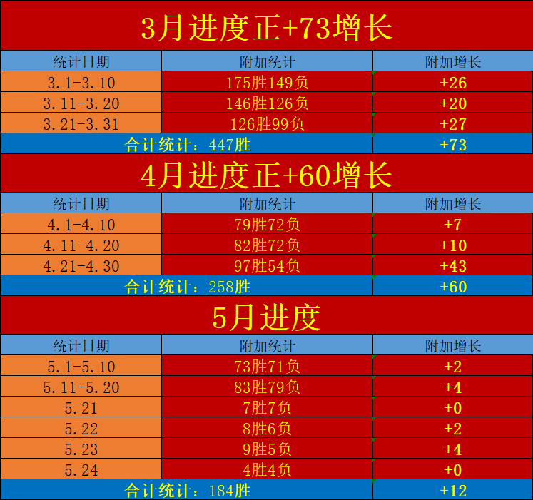 在过去的半年时间里,笔者交出了连续23个胜利旬计划的增长表现,数据击中能力整体稳定且优秀,当中出现微弱的阶段数据调整属于合理范围,总体数据净增依然体现出了数据模块对主流赛程的积极调整能力,此前4月的赛程计划里虽然在前中期赛程受到较多的冷意阻击无法进一步扩大优势,但是在经历合理的数据调整和观点修正过后,4月整体成绩也是顺利获得优秀的正向收官,目前的5月增长进程虽然进度有所放缓但整体仍以稳定的增长表现交出正向发挥,继续保持对数据模块的信任和追踪,才是真正能够收获正向增长的关键动作,本日继续精选值得关注的焦点赛程进行组合冲击,争取顺利开启5月下旬赛程计划,与大家携手扩大胜利优势迈向笔者的第24个连续胜利旬计划!