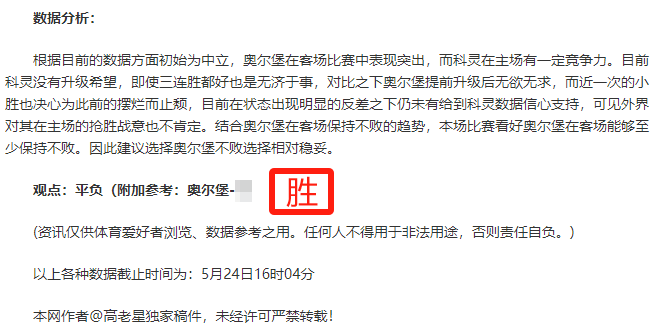 (温馨提示:观点回顾为已完场赛事的统计,并不能代表未来的观点预测结果走势,观点仅为其个人意见,与平.台无关。资讯仅供体育爱好者浏览,并不构成购.彩建议,任何人不得用于非法用途,请广大用户理性消费。)
