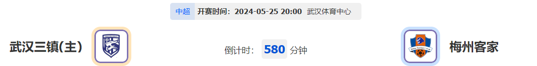 北京时间2024年05月25日20时00分,中超联赛第14轮比赛,武汉三镇主场迎战梅州客家,武汉三镇能否借主场之利战胜对手,再次争取3分?让我们拭目以待!