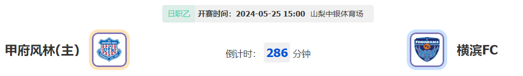 北京时间05月25日15:00,日职乙第17轮,甲府风林对阵横滨FC。甲府风林主场作战,此番能否发挥主场优势迎战对手?横滨FC本赛季表现优异,此役能否在客场延续良好状态?