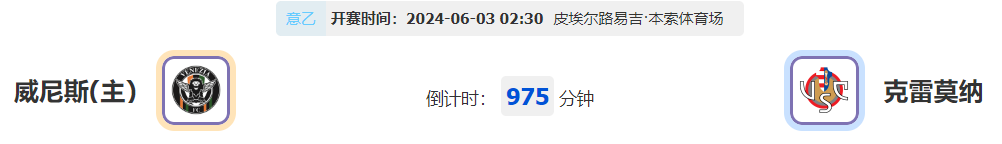 2023-24赛季意大利足球乙级联赛升级附加赛决赛次回合打响,威尼斯主场迎战克雷莫纳。意乙联赛共20支球队,以主客场双循环作赛,联赛前2名直接升级,3-8名参加升级附加赛,倒数第4-5名参加保级附加赛,后3名直接降级。威尼斯是意乙上游份子,球队本赛季常规赛表现出色,以21胜7平10负积70分的成绩排名常规赛第3位,从而获得升级附加赛资格,并在升级附加赛第2轮两回合3-1战胜巴勒莫,从而挺进升级附加赛决赛。