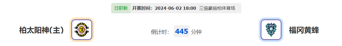 北京时间2024年6月2日18:00,日职联将迎来一场焦点对决,柏太阳神主场对战福冈黄蜂,柏太阳神上轮联赛客场0-4惨败于横滨水手脚下,士气难免受损,好在此役有主场优势,球队近期主场斩获3连胜,那么柏太阳神此役能否借主场之利重返胜轨呢?福冈黄蜂上轮联赛作客以2-1击败了新泻天鹅,成功止住3连败颓势,士气正盛,此役作客又能否再接再厉呢?