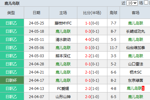 3、两队在此前6次交手记录当中,鹿儿岛联1胜5平稍处上风。