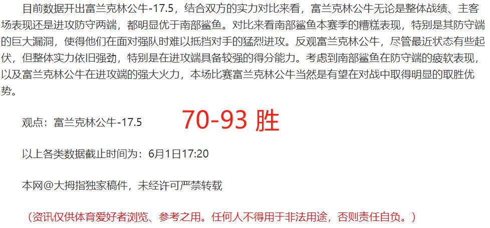 (温馨提示:观点回顾为已完场赛事的统计,并不能代表未来的观点预测结果走势,观点仅为其个人意见,与平.台无关。资讯仅供体育爱好者浏览,并不构成购.彩建议,任何人不得用于非法用途,请广大用户理性消费。)