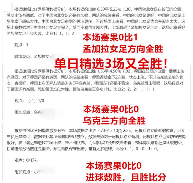 昨日精选3场再全胜!精选8连胜+精选22负3!昨日精选的孟加拉女方向告捷,晚间乌克兰方向继续再胜,阿甲进球数告捷,且胜比分,单日精选3场又全胜!还是非常满意!公开的塞尔超进球胜,赞赏差点!感谢兄弟们的长期支持,今日继续精选好的赛事,争取能够大胜拿下!好好出击,再创佳绩!——今日重点参考乘胜追击!老铁们一起冲!