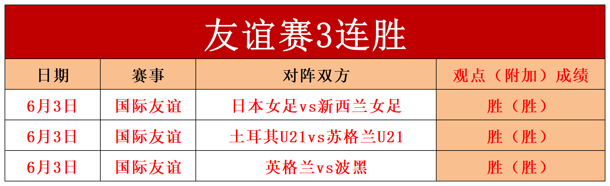 昨天拿下3胜,第一场国际友谊赛日本女足vs新西兰女足,进球数大方向准确打出,第二场国际友谊赛土耳其U21vs苏格兰U21,也是进球数大方向打出,第三场国际友谊赛英格兰vs波黑,进球数小方向打出,笔者近期取得6胜4的佳绩,其中友谊赛3连胜,状态正盛,今天我们再接再厉。笔者分享的赛事涵盖范围广,有欧洲主流联赛,美洲主流联赛,亚系热门赛事,各类杯赛等等,笔者推.荐的方式有胜负和进球数建议,对于各种赛事笔者会反复琢磨数据的变化,全方位研究赛事的动向,以达到方向的顶值,今天的几场重点赛事经过了昨晚一夜的反复测试和研究,信心很足,切勿错过。