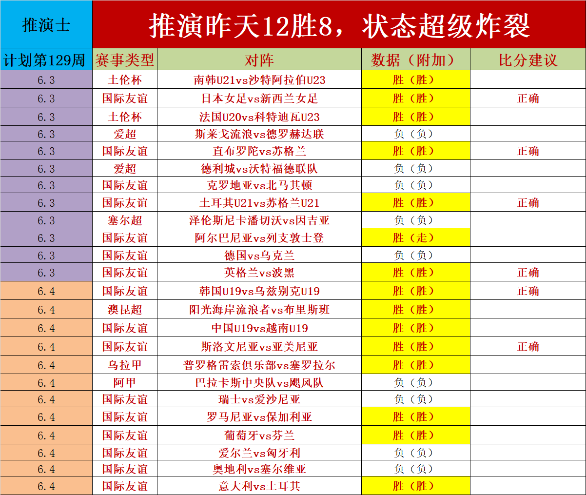 1、昨天再次状态炸裂,拿下12胜8的佳绩,净增+4场,并且击中2场比分,含金量十足,近36天共击中了110场比分,昨天又击破了多场冷门,今天继续乘胜追击。