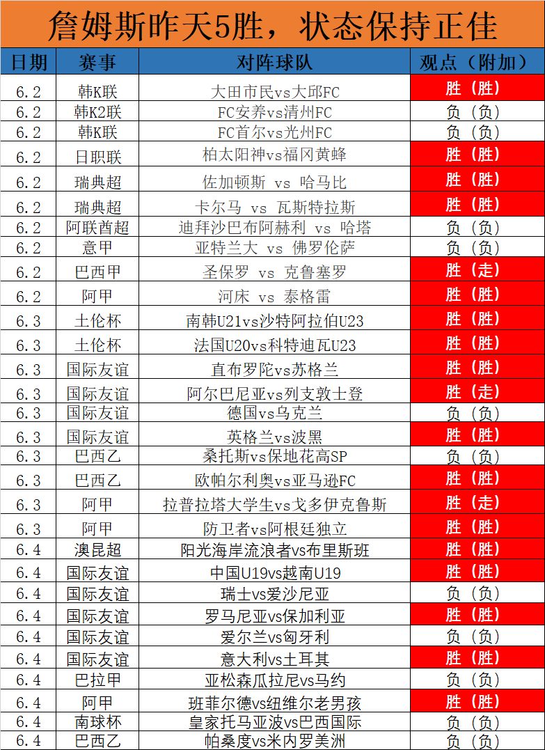 回顾昨天赛事:昨天5胜观点正确,两天拿下18胜11的战绩,净增+4场,保持着正佳的状态,早上的南球杯有点遗憾,多次取消进球,这也是不可控的情况存在,今天五星建议继续。