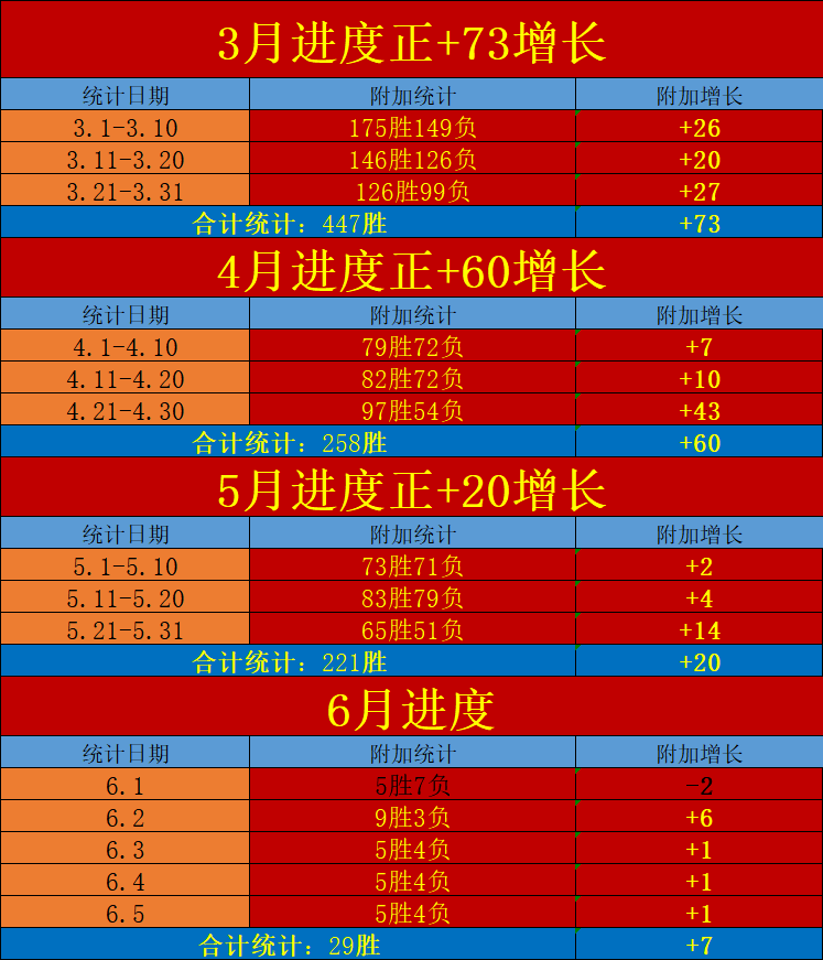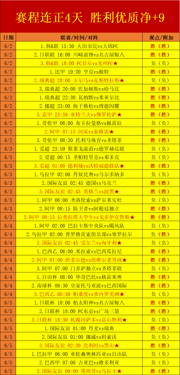 昨日继续收获胜利!赛程连正4天!近4天赛程豪取24场胜利,正向净增狂+9增长!经历了6月首日微弱调整后迅速回到优质的正向增长轨道!过去的5月赛程里,笔者合计取得了净+20的正向胜利净增,对于数据稳定把握能力可见一斑!继续保持对数据模块的精选信任,抽取本日值得关注的焦点赛程组合出击,争取快速完成调整并回到增长轨道上!
