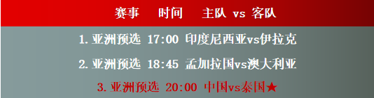 3. 中国vs泰国★,中国队本次预选赛4场比赛取得2胜1平得分表现,攻守端数据发挥大开大合,球队在换帅之后的2场比赛表现向好,在亚预选赛中的表现给予了球迷增添了不少信任。上一场对阵新加坡的比赛中,中国队以4:1的大胜收场,展示了强大的进攻火力,结合主场优势,球队士气正盛。此外,本次比赛对于中国队至关重要,因为一旦取胜,他们将提前锁定晋级资格,这无疑进一步提升了球队的战斗意志。在防守方面,中国队在过去几场比赛中也有较好的表现,能够有效限制对方的进攻。本场迎战的对手是小组出线的主要竞争对手泰国队,后者分组赛4场比赛取得1胜1平得分表现,攻守端数据发挥微弱失衡,泰国队在近期比赛中的表现则波动较大。虽然在客场对韩国的比赛中勉强拿到了一场平局,但上一场主场对韩国的比赛中还是以0:3的较大比分落败。泰国队在防守端存在明显的漏洞,多次让对手获得进攻机会。尽管球队也有一些具有实力并且是效力与亚区一流联赛的球员,但整体配合和战术执行力还是稍微要逊色于中国队。泰国目前在分组赛的形势上是落后了中国队3个积分,剩余的2场比赛是还有追赶和反超机会的,若想要在本场比赛中有所作为,需要在战术上进行调整,并且需要球员发挥出色的个人能力。