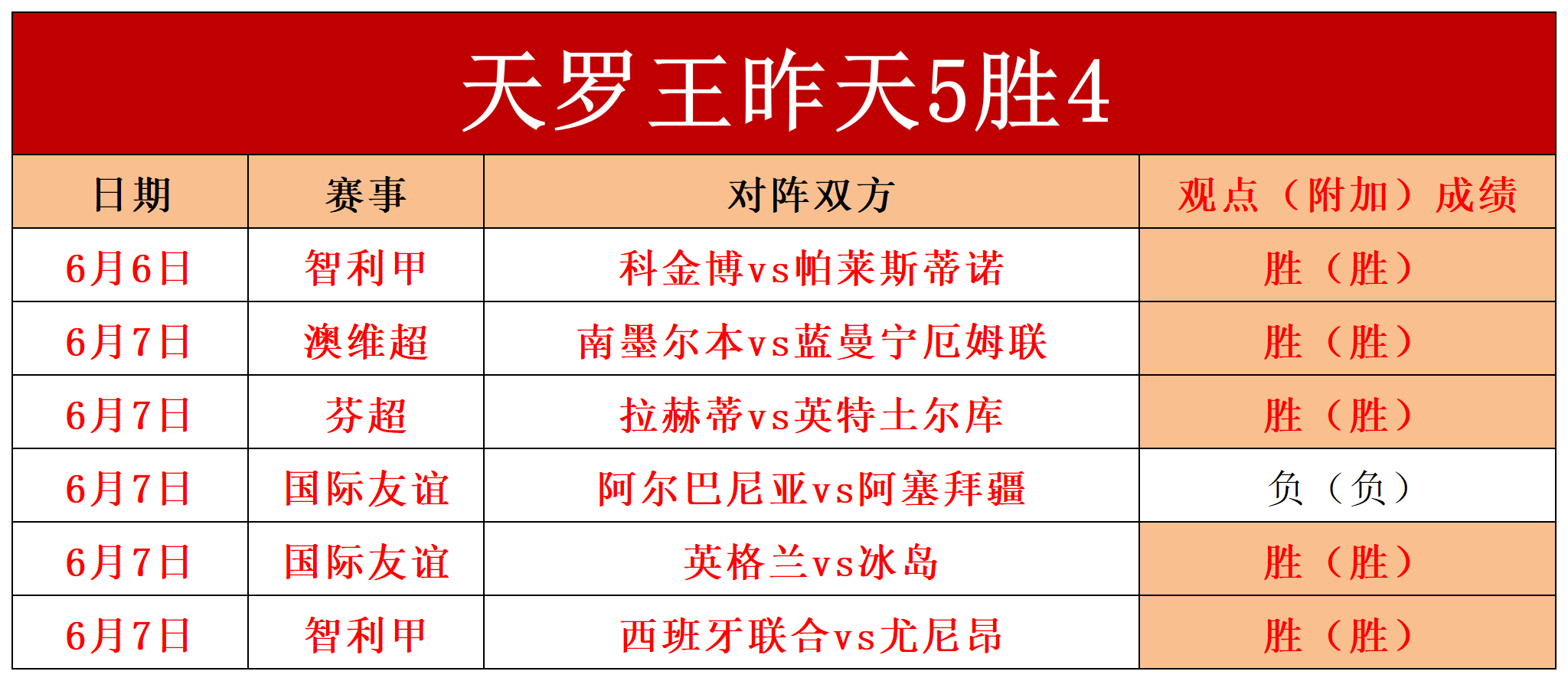 昨天状态炸裂,拿下5胜4的佳绩。第一场澳维超 南墨尔本vs蓝曼宁厄姆联,蓝曼宁厄姆联方向打出,第二场芬超 拉赫蒂vs英特土尔库,英特土尔库方向打出,第三场国际友谊 英格兰vs冰岛,冰岛方向打出,第四场智利甲 西班牙联合vs尤尼昂,尤尼昂方向再打出,整体是6胜5的佳绩,值得赞许的是昨天的友谊赛再取胜利,笔者近期分享的12场友谊赛只有2次失手,并且拿下8胜的优秀战绩,今天我们再接再厉。笔者分享的赛事涵盖范围广,有欧洲主流联赛,美洲主流联赛,亚系热门赛事,各类杯赛等等,笔者推.荐的方式有胜负和进球数建议,对于各种赛事笔者会反复琢磨数据的变化,全方位研究赛事的动向,以达到方向的顶值,今天的几场重点赛事经过了昨晚一夜的反复测试和研究,信心很足,切勿错过。