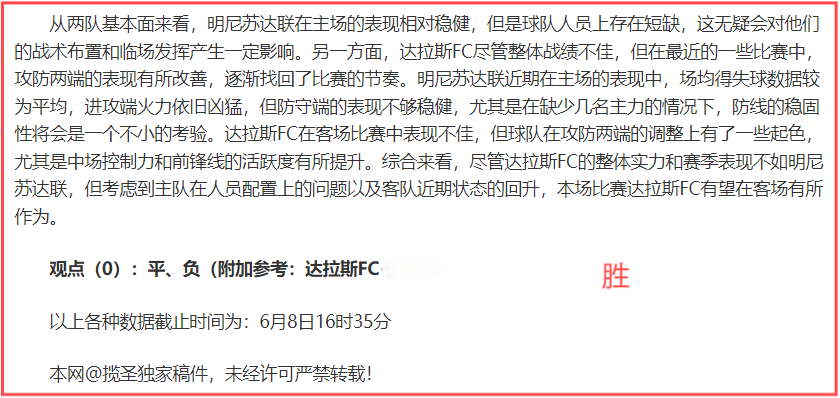 昨天拿下双胜,第一场西乙:奥维多0-0埃瓦尔,进球数少的方向准确打出,第二场美职业:明尼苏达联1-1达拉斯FC,达拉斯FC方向再打出,今天再接再厉。足球比赛是追求长期的稳定,长期的关注才能得益,一时的下滑并不意味着失败,大家不要因为一时的下滑而放弃关注,笔者会努力挖掘更精准的赛事分享给大家,感谢大家的支持。