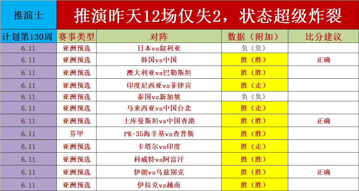 1、昨天状态超级炸裂,12场仅失2场,击中了3场比分,昨天炸裂状态势不可挡,又打出高质量的赛果,比分正确率极高,近43天共击中了136场比分,这就再次证明笔者的预测方向十分精准,昨天其中最热,关注度最高的中国队对阵韩国队,笔者成功预测正确,笔者看好韩国小胜,进球数不会多,因为中国只能防守,1比0比分十分准确,今天我们乘胜追击。