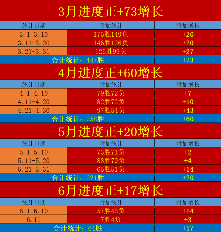 在过去超过的半年时间里,笔者交出了连续25个胜利旬计划的增长表现,数据击中能力整体稳定且优秀,当中出现微弱的阶段数据调整属于合理范围,总体数据净增依然体现出了数据模块对主流赛程的积极调整能力,此前的5月增长进程虽然进度有所放缓但整体仍以稳定的增长表现交出正向发挥,继续保持对数据模块的信任和追踪,才是真正能够收获正向增长的关键动作。本日继续精选值得关注的焦点赛程进行组合冲击,争取与大家携手扩大胜利优势迈向笔者的下一个连续胜利旬计划!
