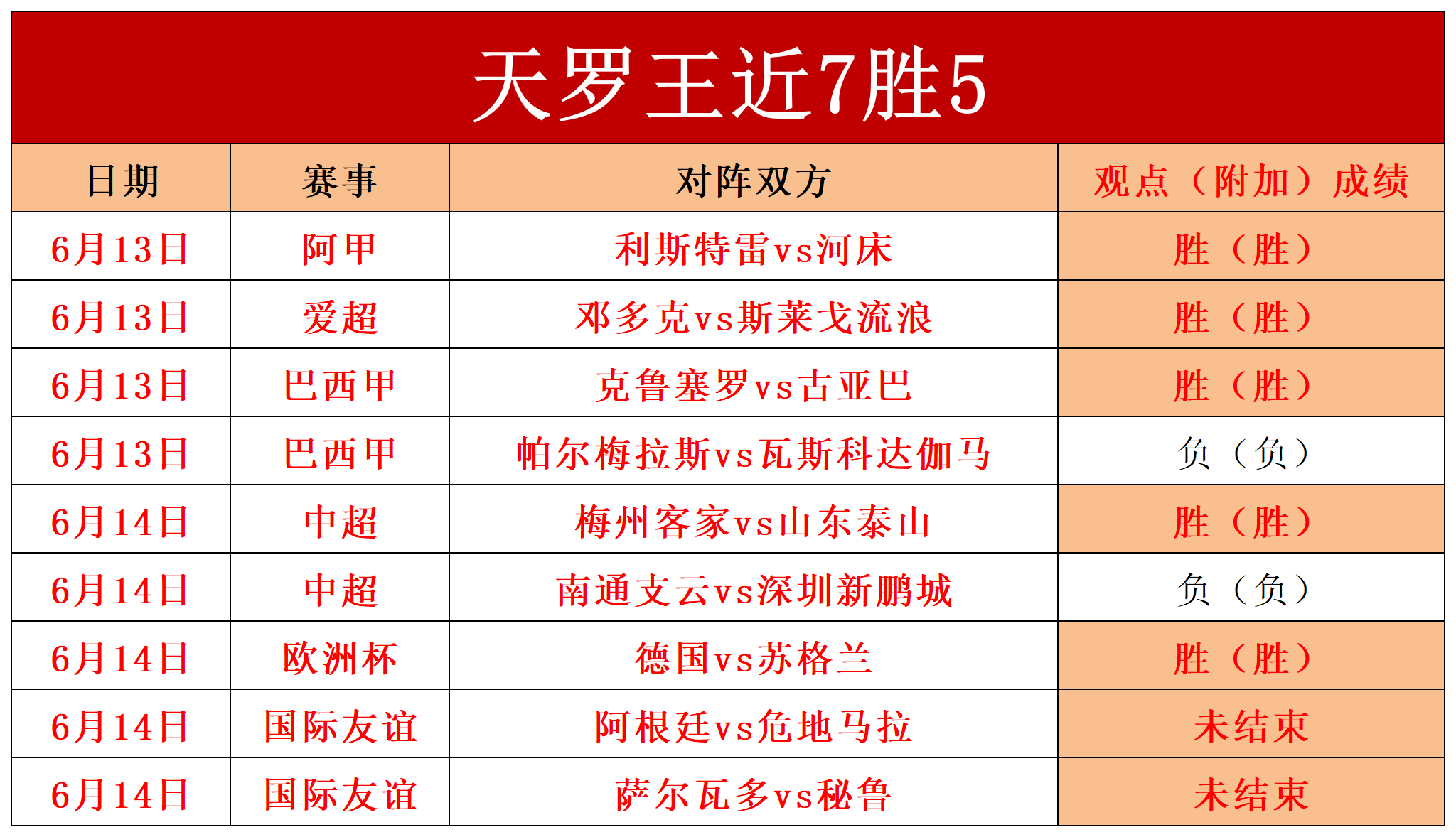 昨天欧洲杯首战告捷,还有中超取得一场胜利,另外有2场友谊赛未结束,笔者目前是7胜5的佳绩,状态正盛,今天我们再接再厉。值得赞许的是中超近期取得10胜7的佳绩,以及近期分享的21场友谊赛只有5次失手,并且拿下了13胜的优秀战绩。这并非偶然,笔者分享的赛事涵盖范围广,有欧洲主流联赛,美洲主流联赛,亚系热门赛事,各类杯赛等等,笔者推.荐的方式有胜负和进球数建议,对于各种赛事笔者会反复琢磨数据的变化,全方位研究赛事的动向,以达到方向的顶值,今天的几场重点赛事经过了昨晚一夜的反复测试和研究,信心很足,切勿错过。
