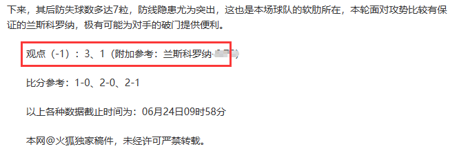 观点回顾为已完场赛事的统计,并不能代表未来的观点预测结果走势,观点仅为其个人意见,与平.台无关。资讯仅供体育爱好者浏览,并不构成购.彩建议,任何人不得用于非法用途,请广大用户理性消费。